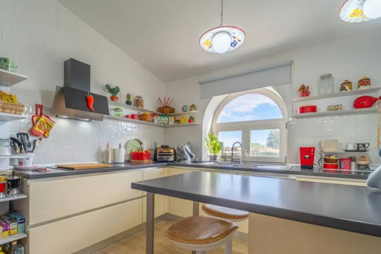 All’interno la villa offre ambienti accoglienti e funzionali. La zona giorno è composta da un soggiorno luminoso con tavolo da pranzo, divano e TV, ideale per trascorrere momenti di convivialità. La casa dispone inoltre di una cucina completamente attrezzata, perfetta per preparare i pasti durante il soggiorno.